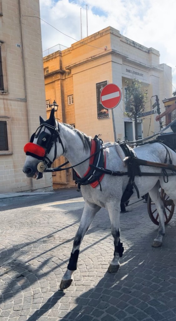 The town is calm and family-friendly. Our hotel looked out over the harbor in St. Julien’s Bay. There are horses roaming about as a mode of transportation in Sliema, and what a wonderful surprise that was to see!